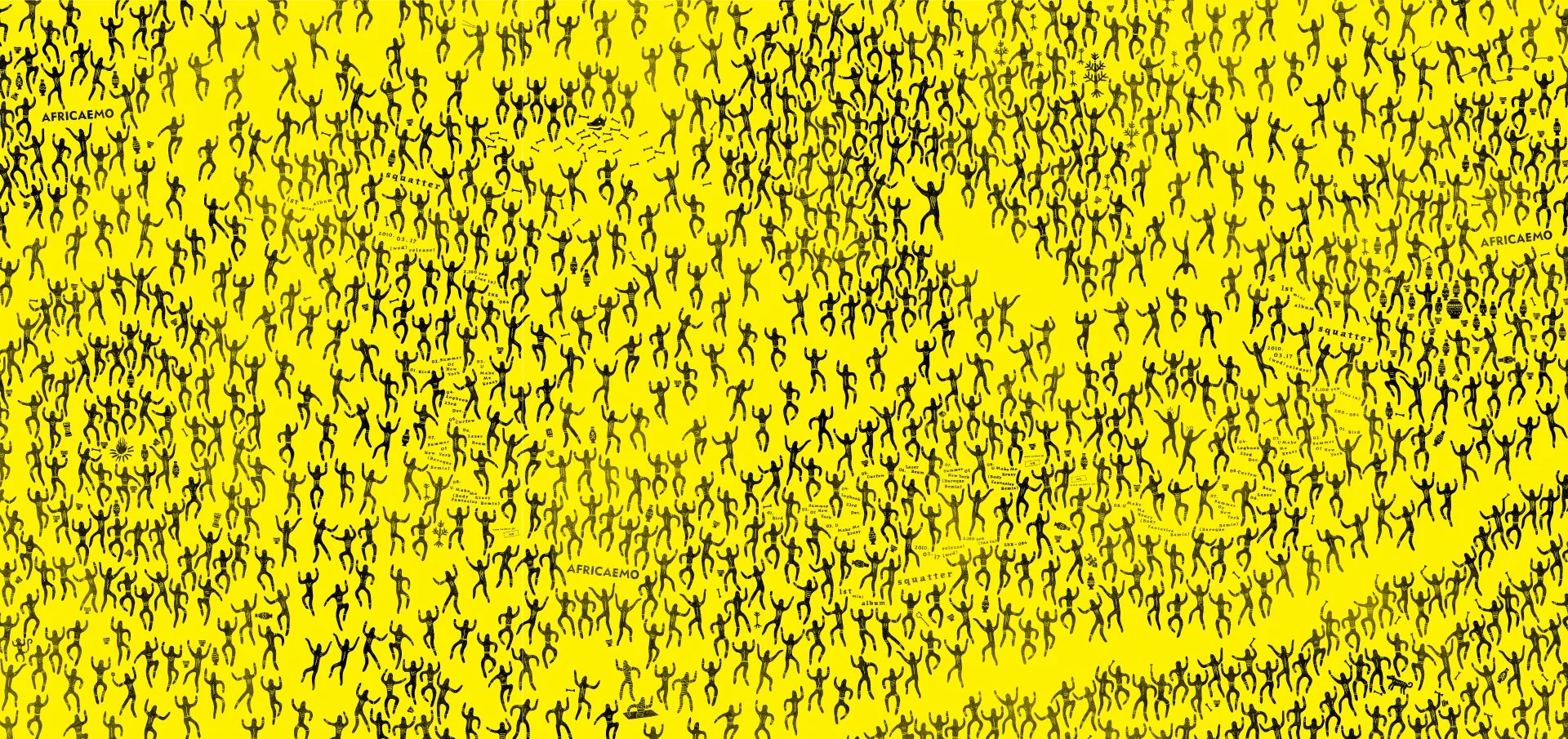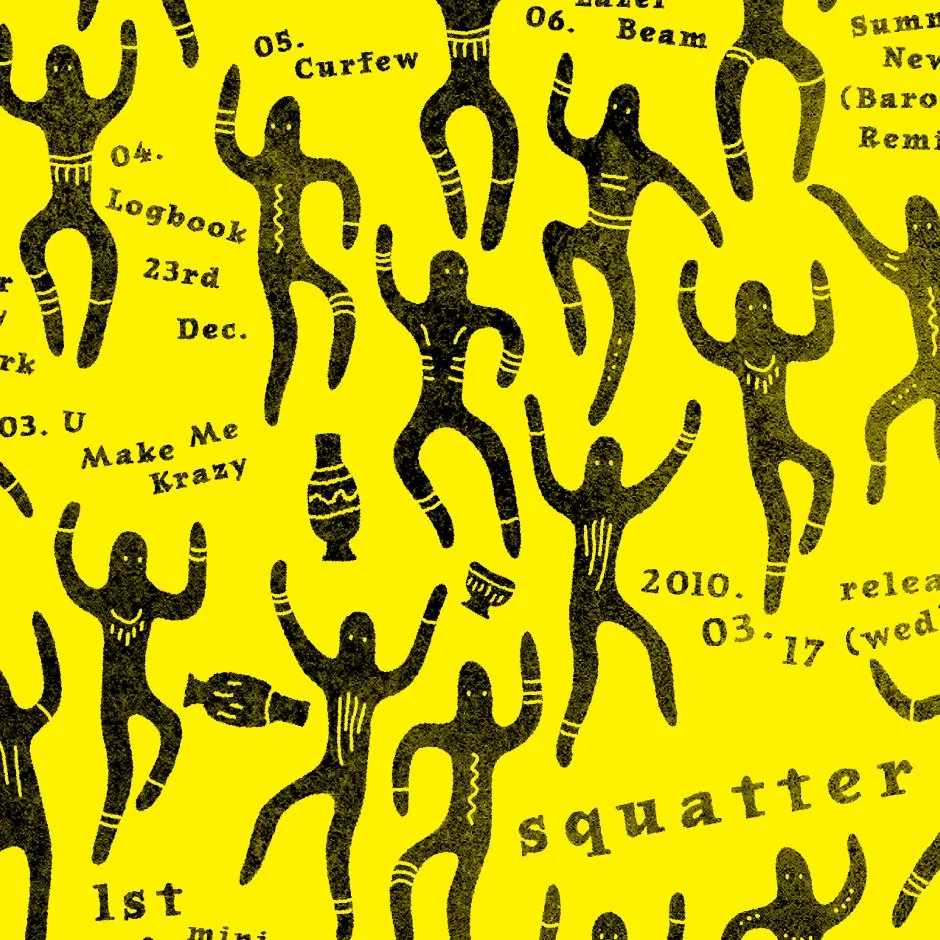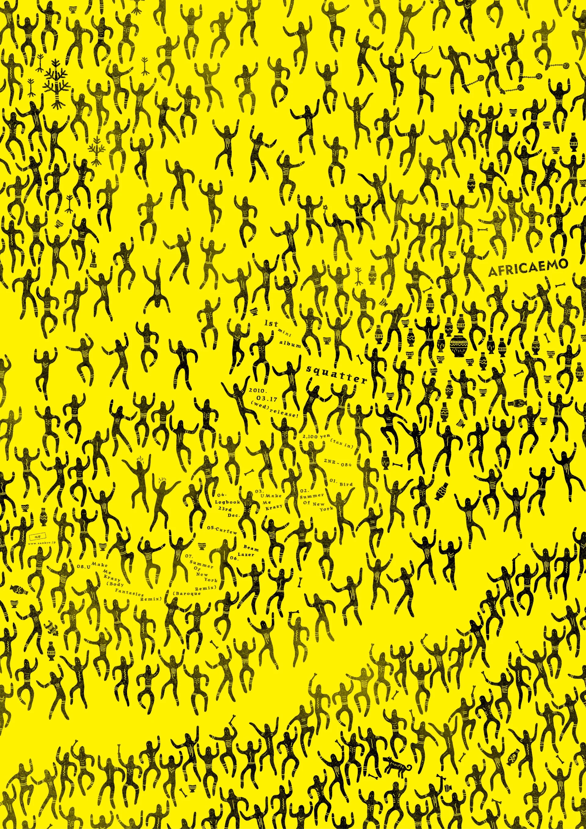 ビビッドなイエローの背景に、アフリカンアートを思わせるタッチで描かれた「Squatter」たちが増殖し、画面を占拠するように踊り狂う。混沌と祝祭が同居するその姿は、音楽の肉体性と解放感を視覚的に体現しています。