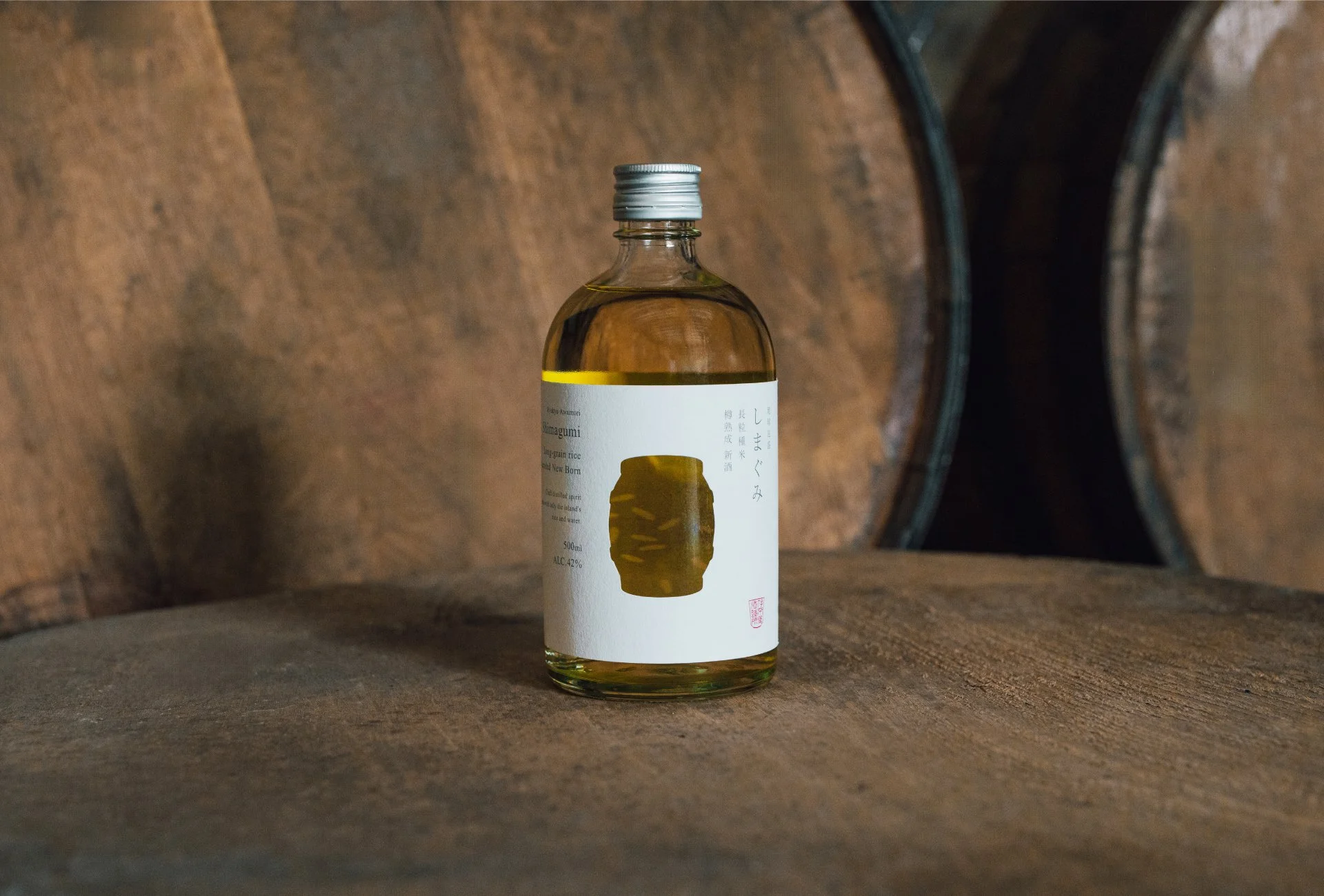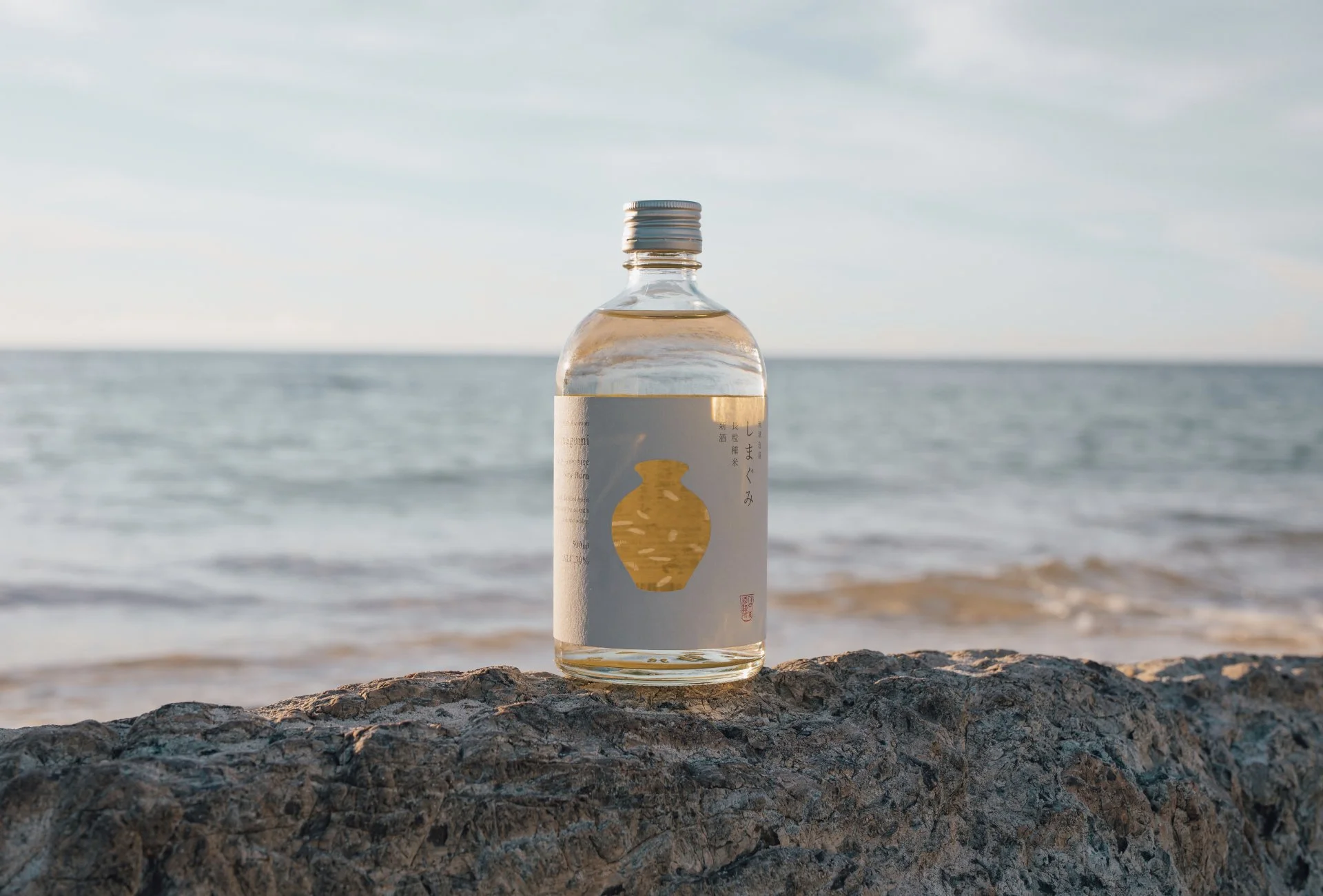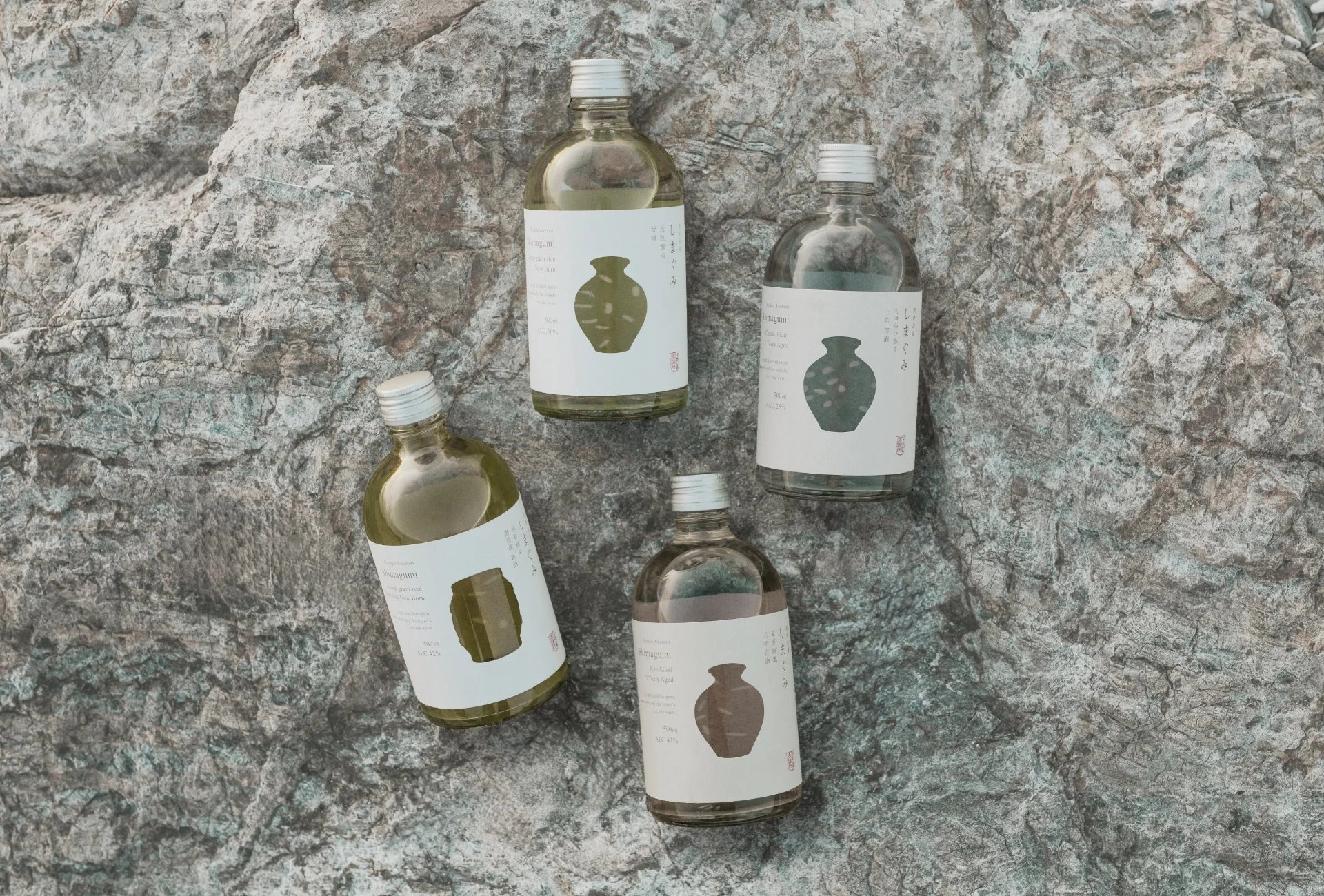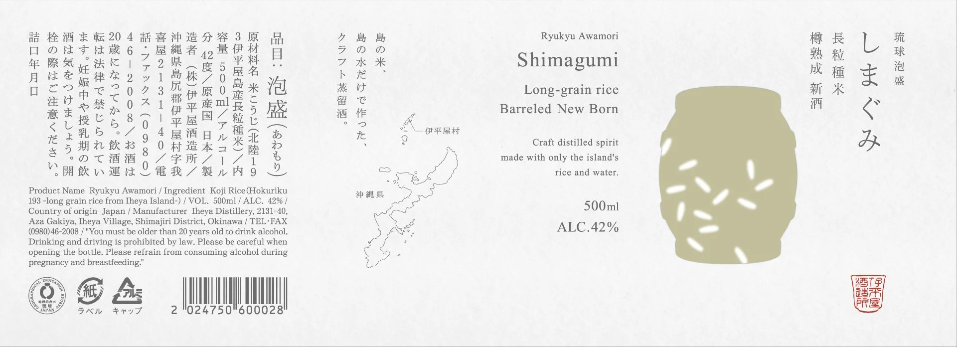Branding for “Shimagumi,” a craft awamori brewed by Iheya Distillery on Iheya Island, northwest of Okinawa’s main island. The name comes from the Okinawan word “gumi,” meaning rice, and literally signifies “island rice.”