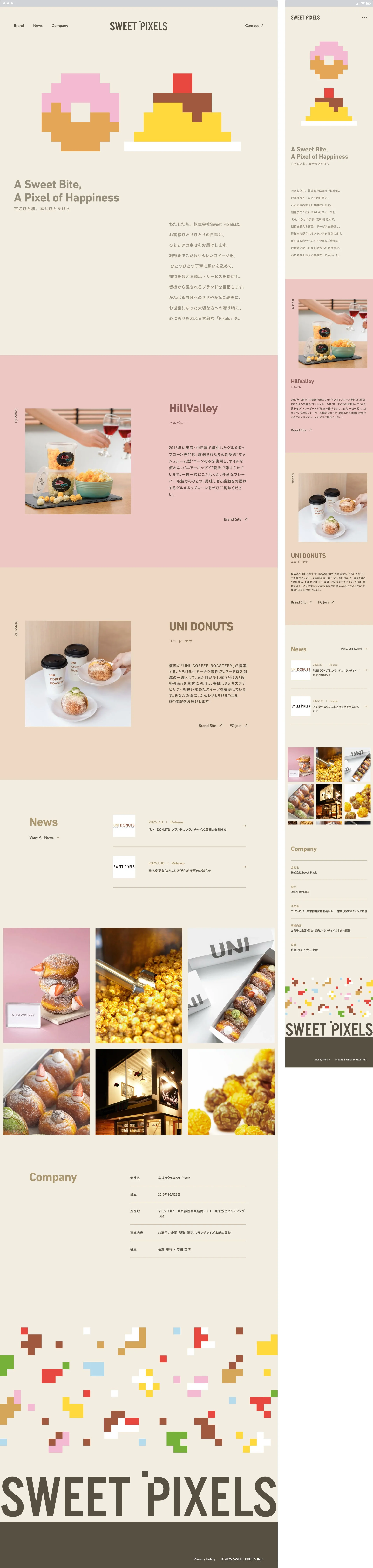 日本ポップコーンから「Sweet Pixels」へのリブランディング。プレミアムポップコーン「HillValley」で知られる同社は、2024年に韓国発の人気ブランド「UNI DONUTS」とのマスターフランチャイズ契約を契機に、ネーミングとロゴを刷新し、ポップコーンや生ドーナツに続く多様なスイーツ展開へと踏み出しました。