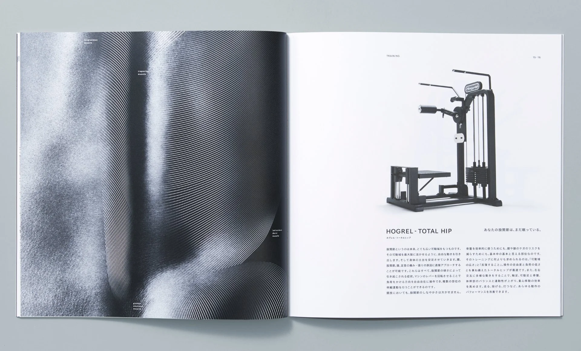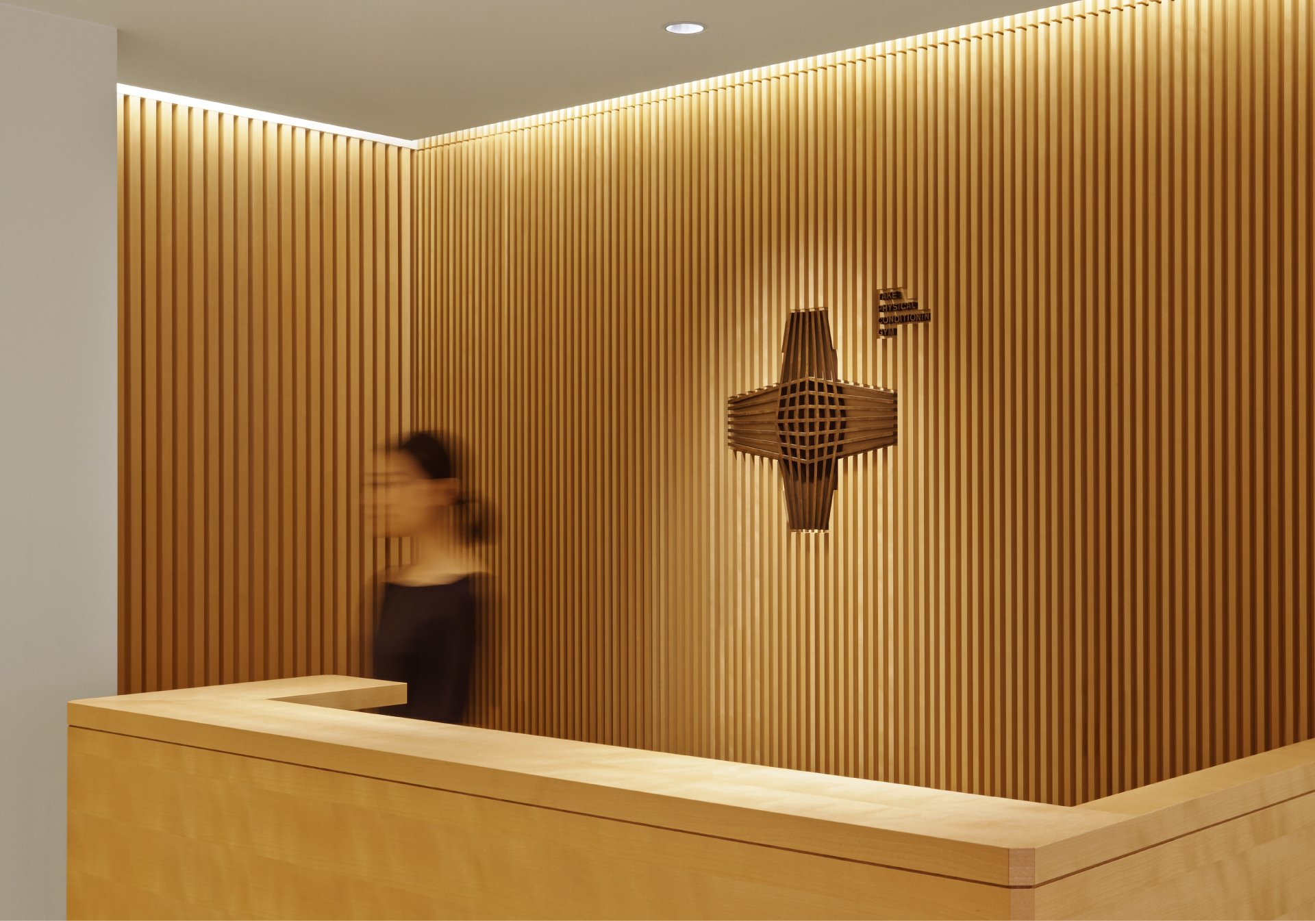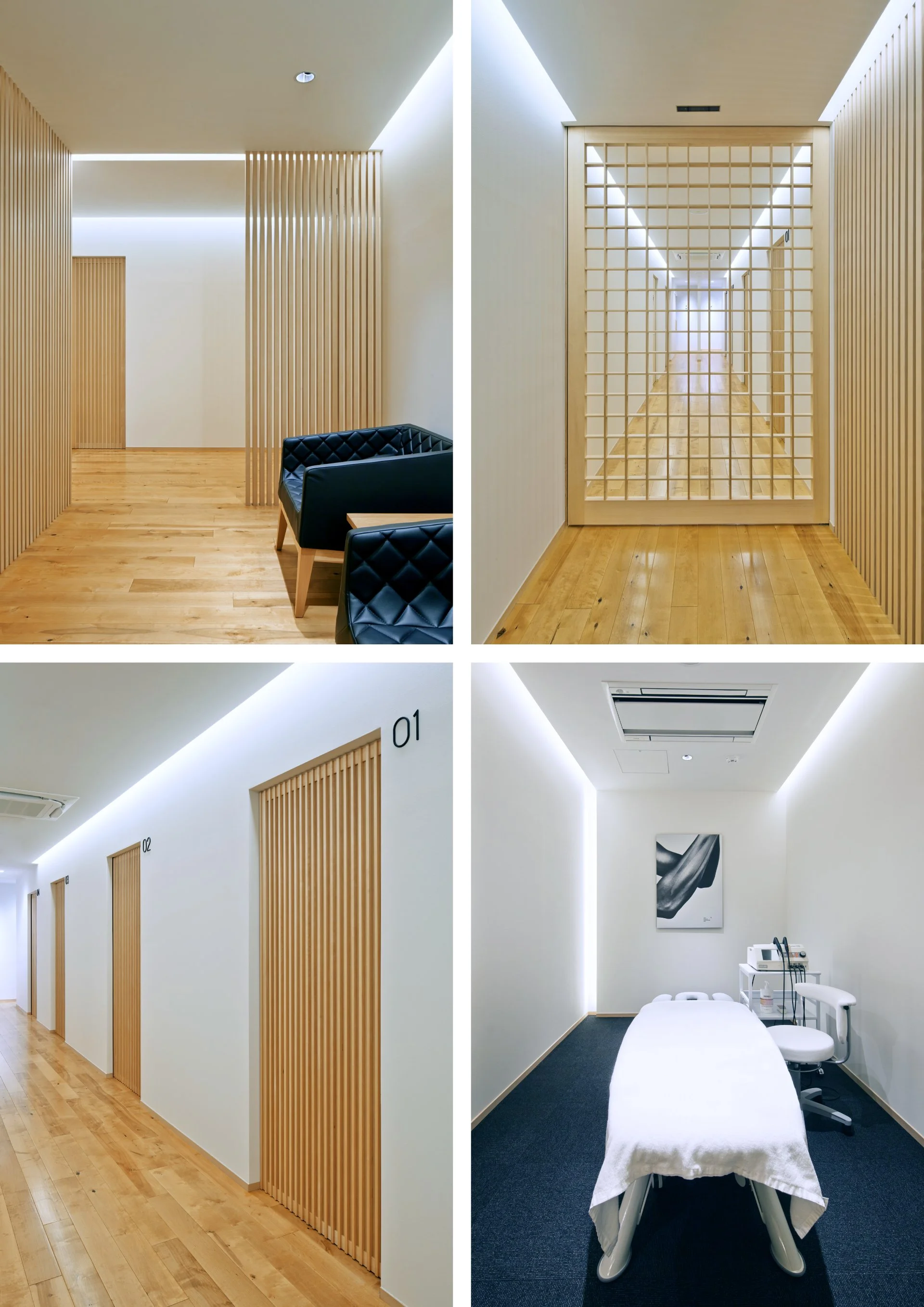 The visual identity embodied the concept of muscle expansion—the core principle of physiotherapy. Intersecting lines formed both the initial “T” and a medical cross, while grid patterns reminiscent of muscle fibers extended into the spatial design, harmonizing with Kyoto’s traditional architectural context.