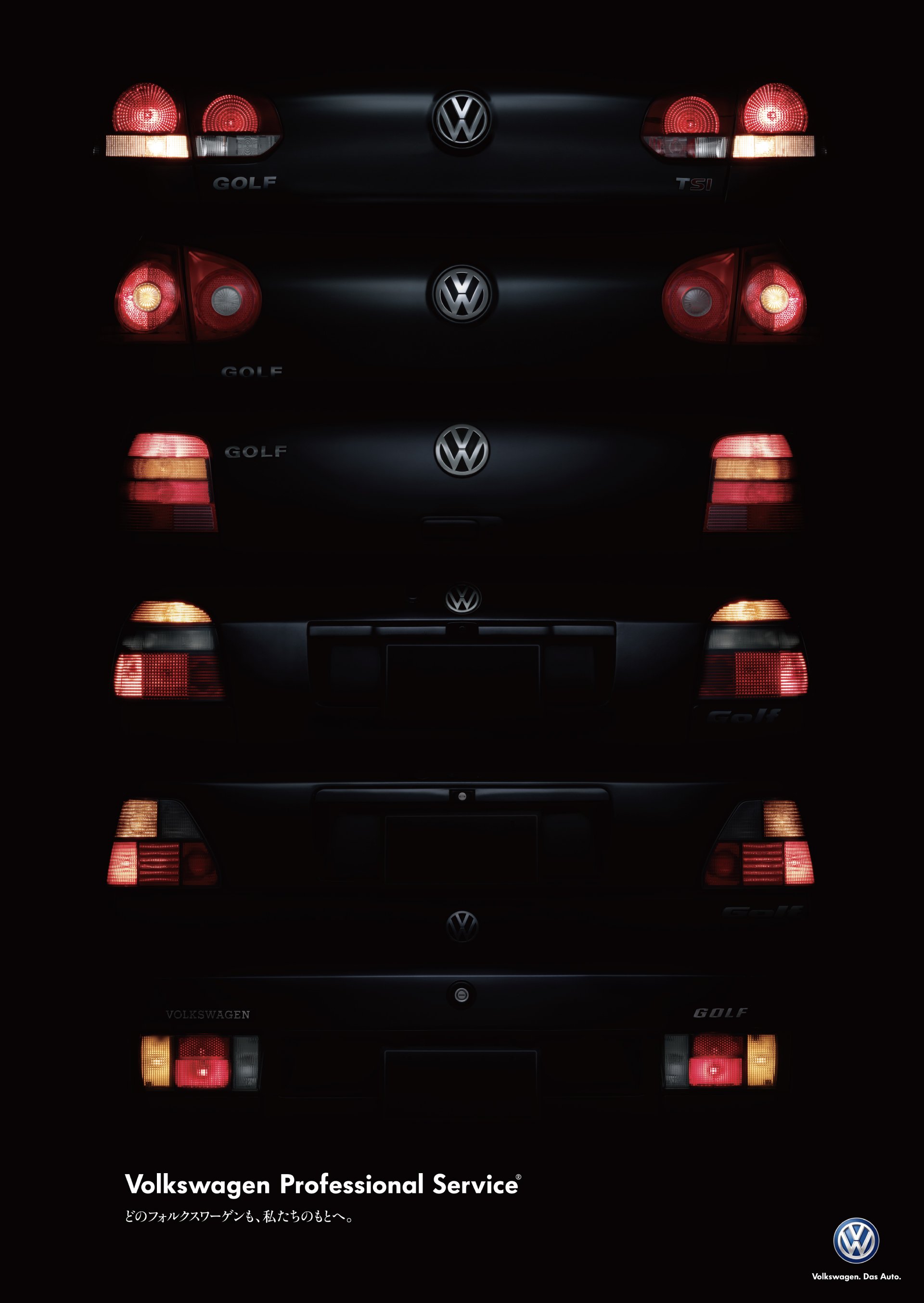 ビジュアルでは、歴代ゴルフのフロントフェイスやリアランプを整然と並べ、そのすべてのライトを点灯。古いモデルから最新車種まで現役で走り続けている姿を象徴し、Professional Serviceによる技術と信頼性を視覚的に示しました。ブランドの歴史と現在を光の列でつなぐことで、世代を超えて受け継がれる安心感を訴求しています。