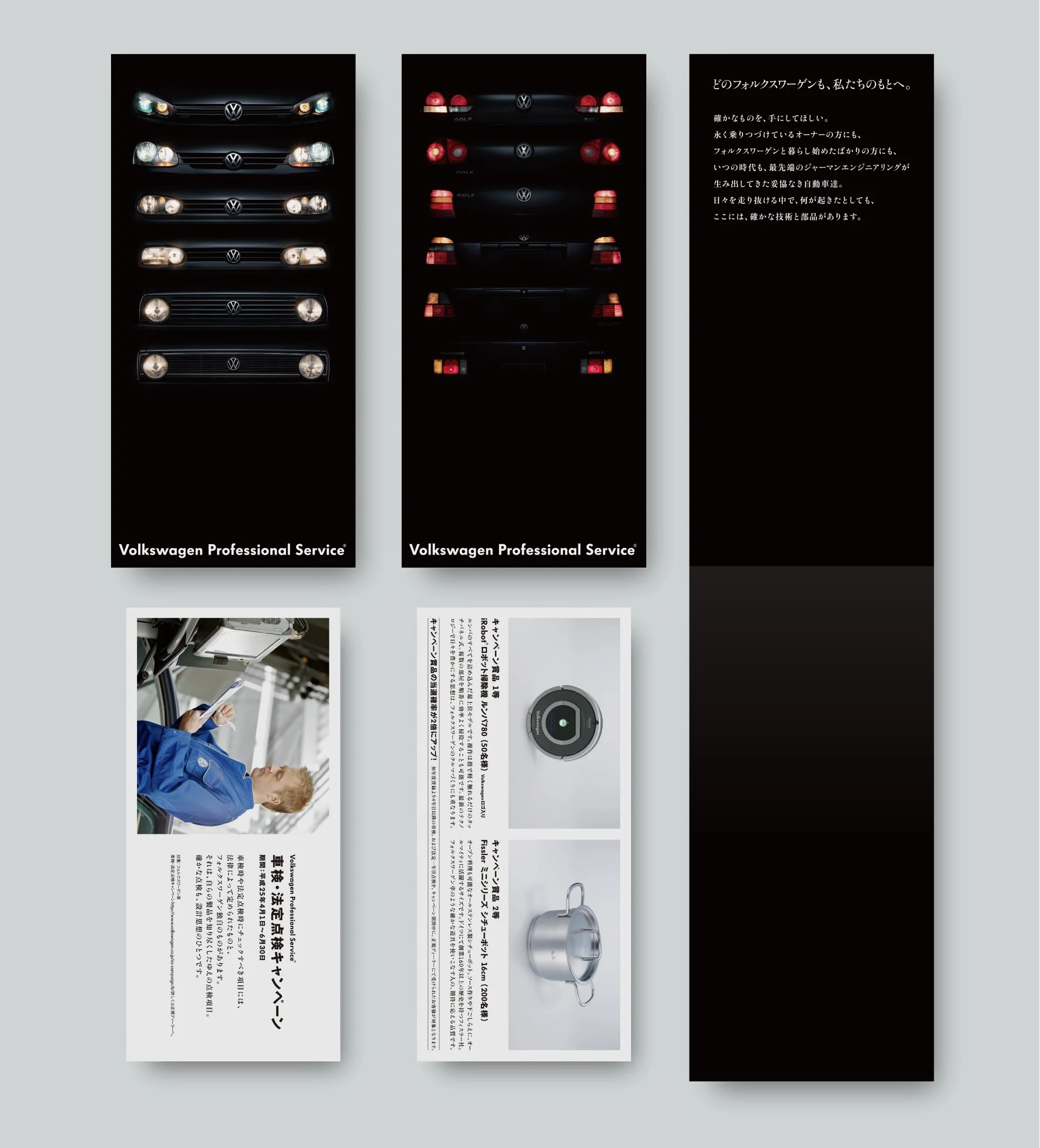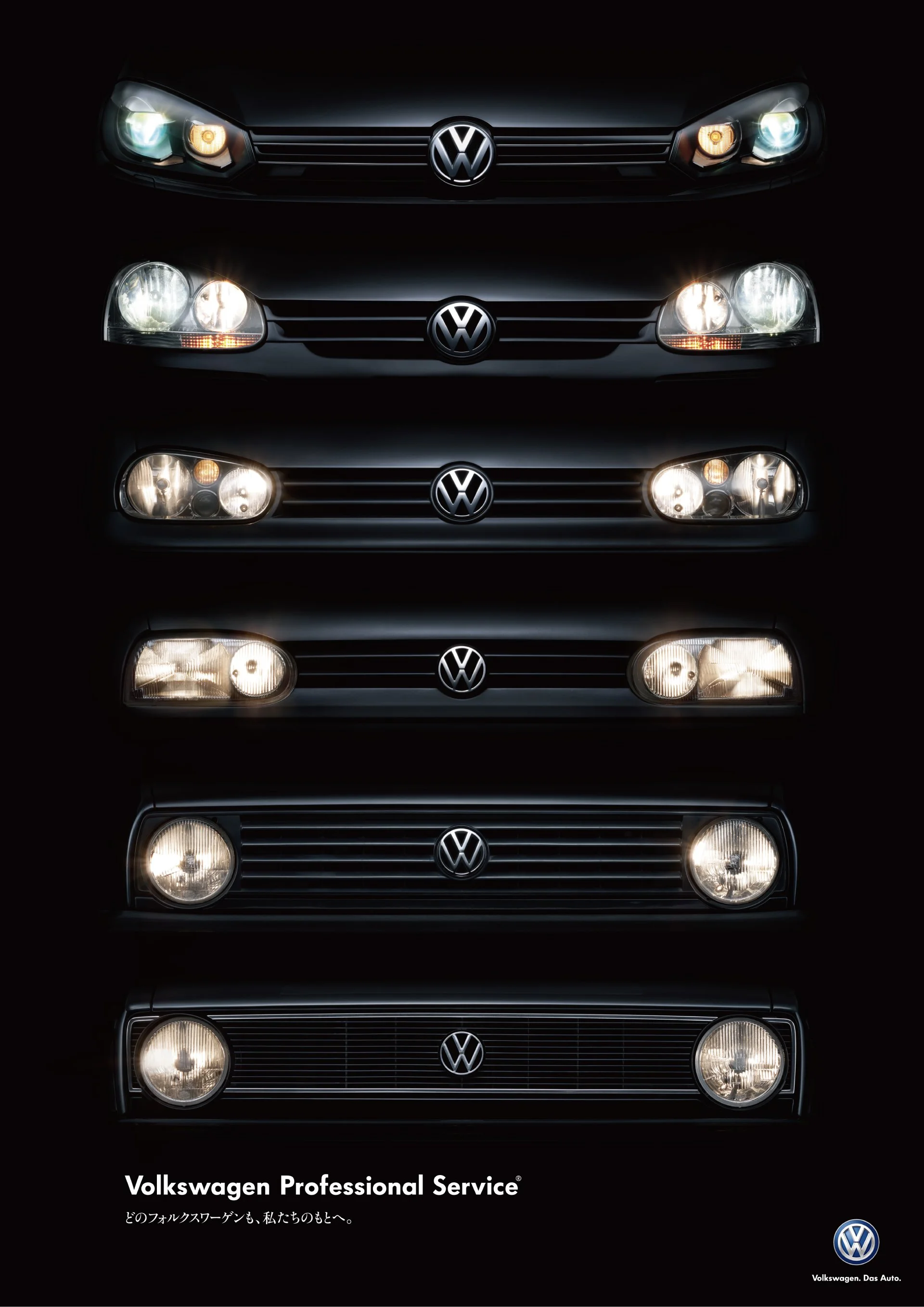 正規メンテナンス「Volkswagen Professional Service」の広告キャンペーン。専門トレーニングを受けたスタッフが専用設備と純正部品を用いて提供し、すべてのフォルクスワーゲンを最適なコンディションで長く維持することを目指しています。