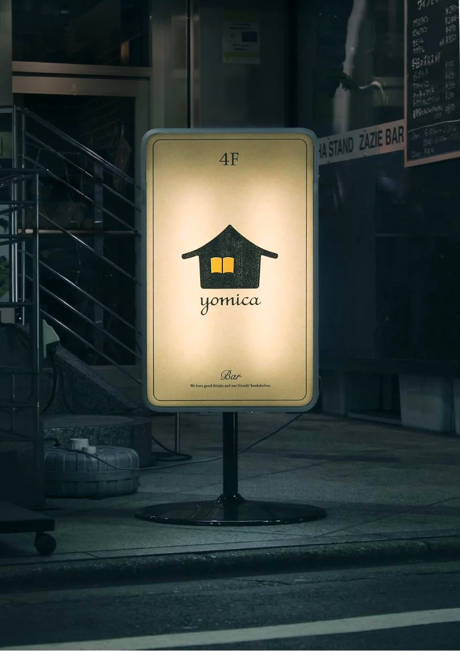 Branding for “yomica,” a book bar in Sangenjaya. Inside, each guest is given their own shelf, lined with a book that has resonated deeply in their life. The name, derived from the Japanese word yomika meaning “reading house,” symbolizes a study-like space where people quietly connect through books.