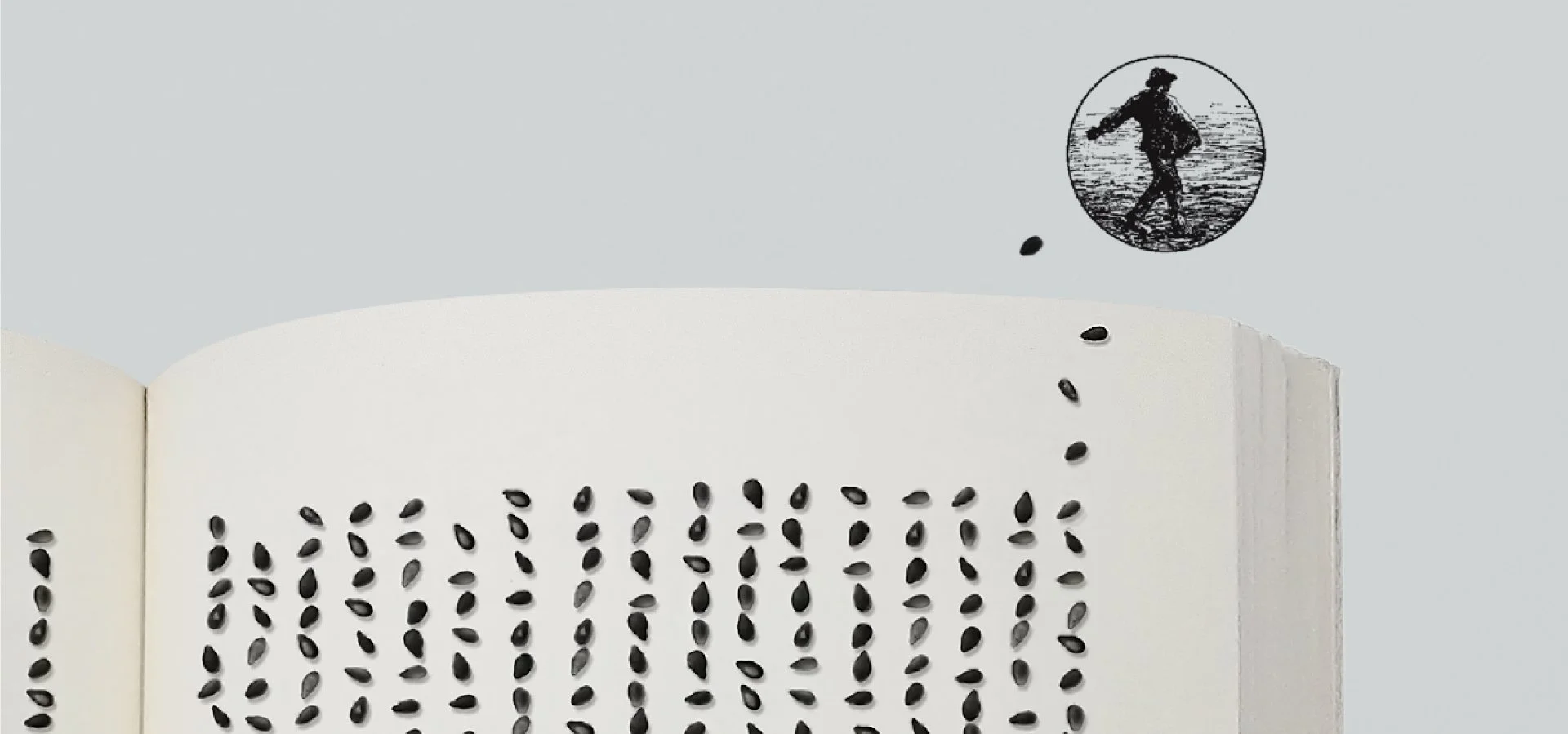読書は即効性こそありませんが、心や思考に少しずつ蓄積し、やがて視野や考えを広げてくれます。その営みを「未来の自分へ種を蒔くこと」と捉えました。岩波文庫のシンボルである「種を蒔く人」に呼応させつつ、文庫本の小さな文字の粒を種に見立て、表現へと昇華しています。